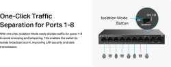 TP-Link LS110P предлага режим на изолация за по-висока сигурност и по-добра производителност при разделяне на клиентския трафик, както и PoE Auto Recovery за по-стабилна работа на PoE устройствата чрез автоматично рестартиране при проблем. Безвентилаторният дизайн осигурява безшумна работа, а plug-and-play подходът прави комутатора подходящ избор за бърза инсталация на PoE суич в Ethernet мрежа.