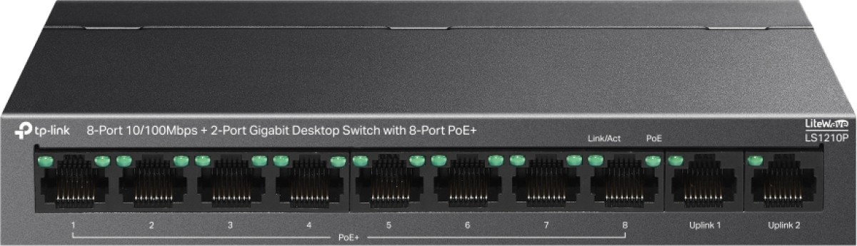 TP-Link LS1210P, 8-портов 10-100Mbps + 2-портов гигабитов настолен комутатор с 8 PoE+ порта