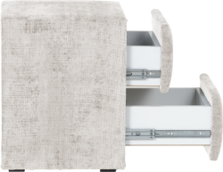 Моделът комбинира дамаска и ПДЧ, което придава уютна визия и стабилна конструкция. С двата си чекмеджета получавате лесен достъп до най-необходимите вещи като книга, зарядно, очила или козметика, без да претрупвате плота.