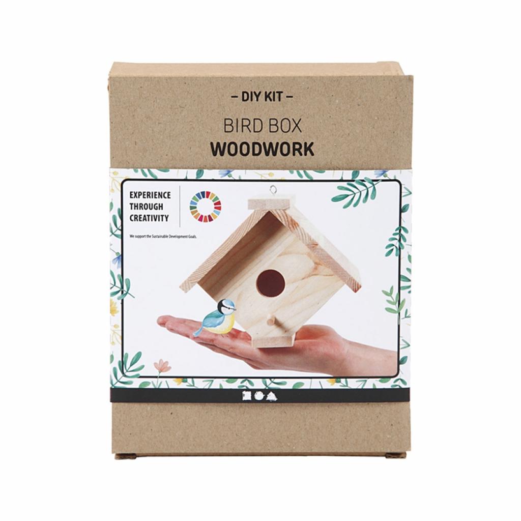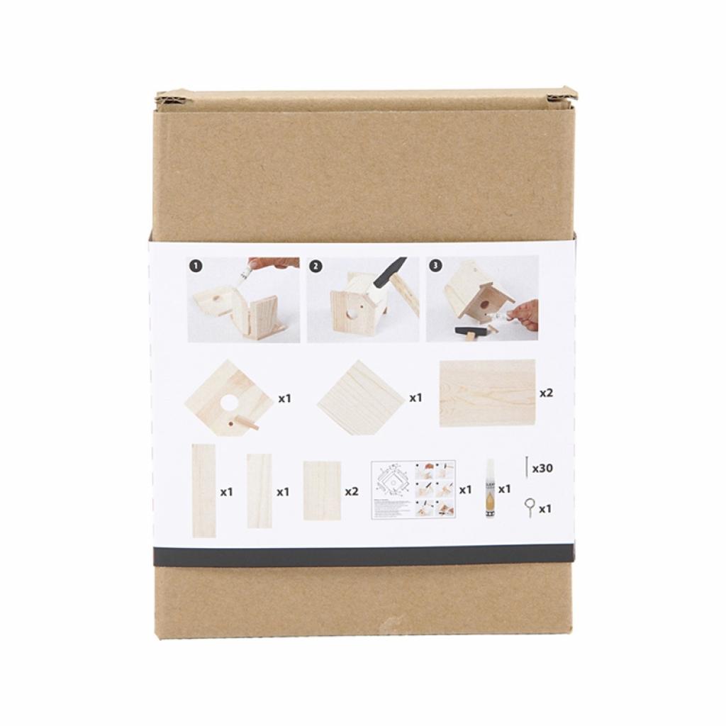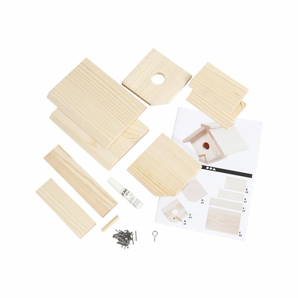 Комплектът съдържа материали за изработка на къща за птици от светло дърво, с отвор – 25 mm.