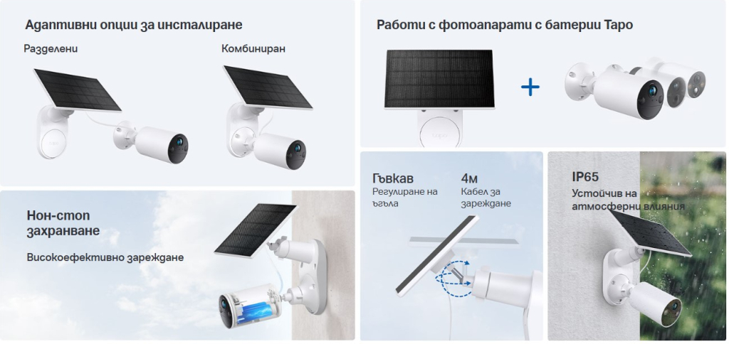 - Съвместим с всички батерийни камери Tapo за денонощна защита.