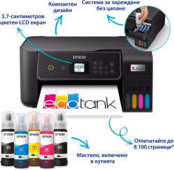 - EcoTank осигурява безпроблемен печат у дома – резервоарите за мастило с ултрависок капацитет позволяват безпроблемно презареждане, а бутилките тип „ключ“ са проектирани така, че да може да се постави само правилният цвят.