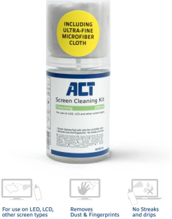 ACT Спрей за почистване на екрани с микрофибърна кърпа,200мл е професионален комплект за безопасно и ефективно почистване на дисплеи и електроника. Осигурява ясна картина и чиста повърхност без риск за чувствителните покрития.