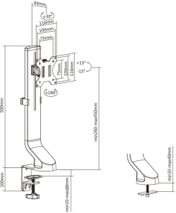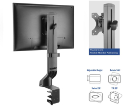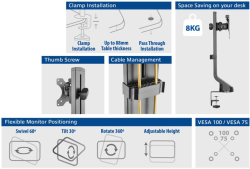 Стойката предлага гъвкаво движение на екрана с наклон, завъртане и ротация, което я прави отличен избор за настройка на оптимален ъгъл на гледане при работа, обучение или видеоконференции. Съвместимостта с VESA 75x75 и 100x100 улеснява монтажа на повечето съвременни дисплеи, а двата типа закрепване към бюро (clamp/grommet) осигуряват стабилност и удобство. Подходяща е като стойка за монитор, мониторно рамо и VESA стойка за монитор в различни работни конфигурации.