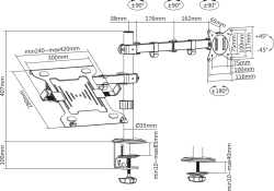 DIGITUS DA-90436 предлага гъвкав монтаж с включена скоба за маса и преходна пръчка, както и бързо освобождаваща се VESA плоча за по-лесен монтаж и демонтаж. Регулирането по височина, наклон, завъртане и въртене улеснява настройката за комфорт при работа, обучение или домашен офис, а регулируемата поставка за лаптоп осигурява стабилно и сигурно захващане.