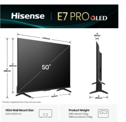 Hisense 50" E7Q Pro комбинира Smart TV функционалност с удобни опции за свързване – Wi‑Fi, Bluetooth, Ethernet, както и богата селекция от портове. Аудиото с Dolby Atmos и DTS Virtual X допринася за по-обгръщащ звук, подходящ за филми и стрийминг платформи. Подходящ е като 4K QLED телевизор за всекидневна, с възможност за монтаж на стена чрез VESA.