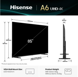 Hisense 85" A6Q, 4K Ultra HD 3840x2160, DLED, DFA, Precision Colour, HDR 10+, Smart TV, Gaming Mode, DVB-T2-C-S2