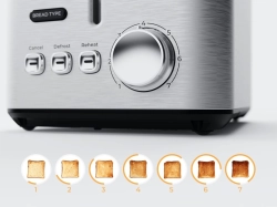 С 7 степени на изпичане и 6 предварително зададени типа хляб, Mechanical control Toaster улеснява избора на точната настройка според предпочитанията ви. LED индикацията дава ясна обратна връзка по време на работа, а функцията за високо повдигане прави изваждането на по-малки филийки по-удобно и безопасно.