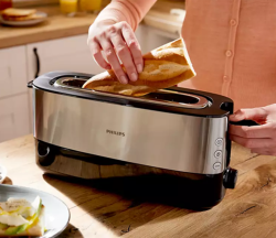 С мощност 1030 W уредът загрява бързо и помага да приготвите тостове според предпочитанията си. Функциите за размразяване и затопляне на хляб улесняват подготовката на закуска, дори когато използвате замразени филии или искате да освежите вече изпечен хляб.