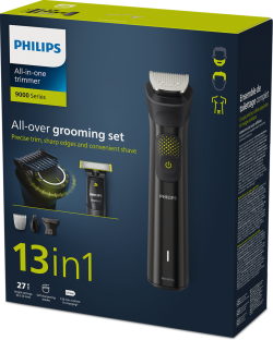 Philips All-in-One Trimmer Series 9000 с OneBlade е многофункционален уред, който може да се използва както на суха кожа, така и под вода. Той предлага дължина на подстригване от 0.2 до 20 мм и включва разнообразни приставки, сред които гребени за вежди, самобръсначка за тяло, тримери за коса, прецизни тримери и регулируеми гребени за преливане и тяло. Батерията е комбинирана NiMH и литиево-йонна, като осигурява до 120 минути работа за тримера и до 30 минути за OneBlade след около час зареждане, а OneBlade се зарежда за 8 часа. Уредът разполага с ергономичен дизайн, гумирана дръжка против приплъзване и е водоустойчив. Има самонаточващи се остриета и технологии BeardSense и OneBlade за прецизна и комфортна грижа. В комплекта са включени четка за почистване, калъф за съхранение, защитна капачка и USB кабел за зареждане. Цветът е сребрист с черни елементи, а гаранцията е 24 месеца.