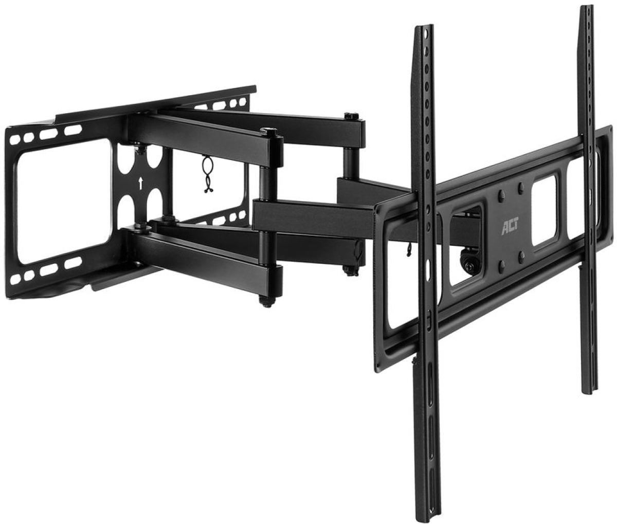 ACT AC8355 Стенна стойка с подвижна конструкция е предназначена за монтиране на плоскоекранни телевизори с размери от 37" до 70" и максимално натоварване до 40 кг. Тя разполага с три въртящи се точки с максимално разширение от 464 мм, осигурявайки гъвкаво позициониране. Стойката предлага наклон от -15° до +5°, въртене от -60° до +60° и регулиране на нивото на екрана от -3° до +3°. Допълнително притежава система за управление на кабелите и нивелиращо ниво за прецизно инсталиране.