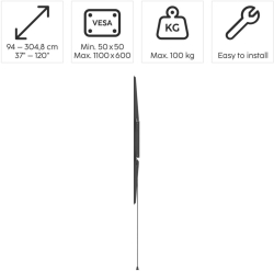 Стенна стойка за TV, 120 (305 см) до 100 кг, разстояние от стената 2,8 см е практично решение за сигурен и елегантен монтаж на телевизор на стена. Фиксираният дизайн осигурява стабилност и изчистен вид с минимална дистанция до стената.