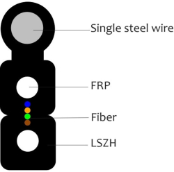 FTTH оптичен кабел с четири G.657A1 оптични влакна, два FRP укрепващи елемента, 1.20 мм стоманен носач и LSZH външна обвивка.