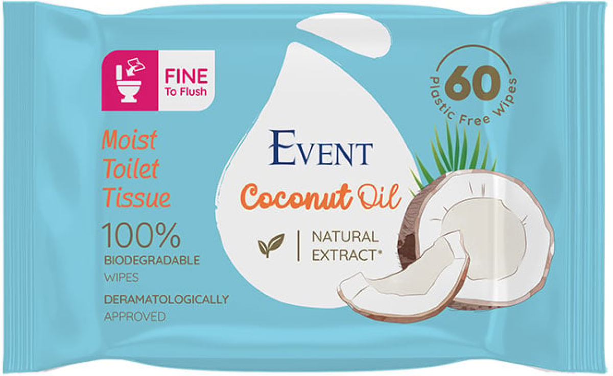 Тоалетна хартия Event, влажна, с масло от кокос, 60 къса