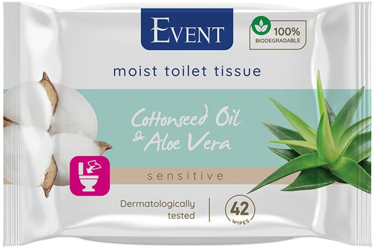 Тоалетна хартия Event, влажна, с масло от памук и алое, 42 къса