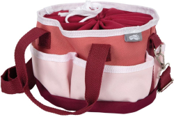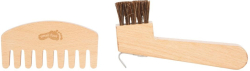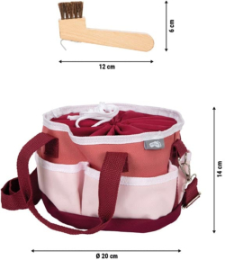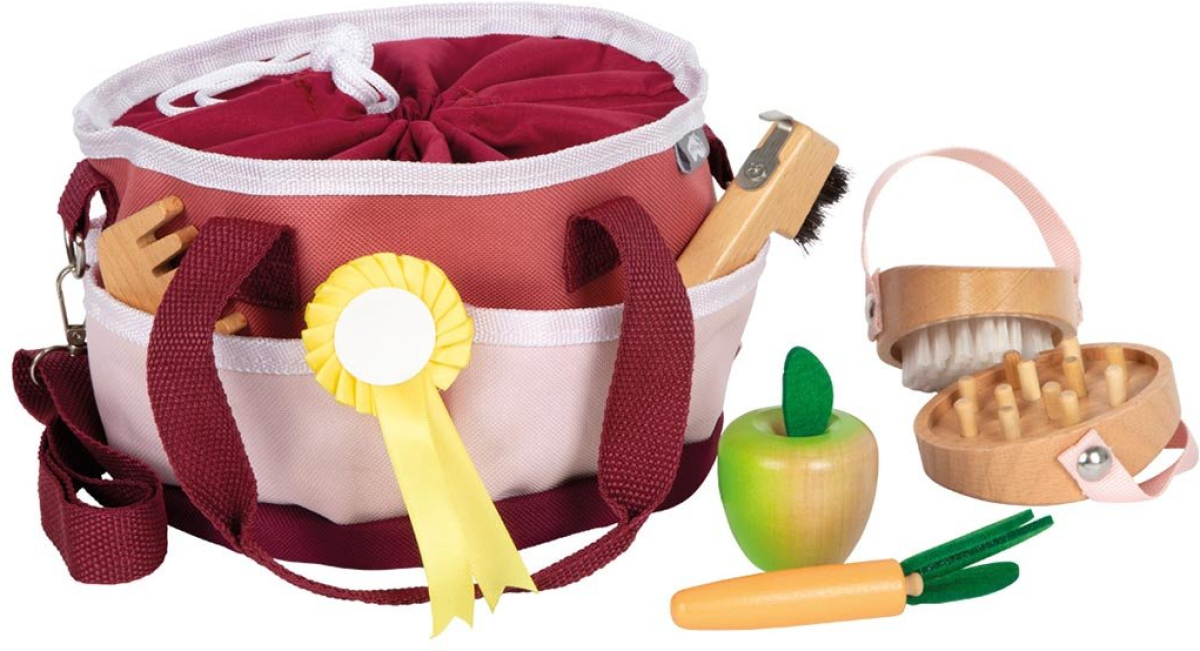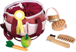 Всичко необходимо за грижа за играчки-кончета: детски комплект за поддръжка на коне в практична текстилна чанта с дръжка & презрамка. Включва дървена четка, гребло за грива, инструмент за почистване на копита с четка, гребен за грива, както и ябълка и морков за въображаемо хранене.