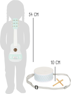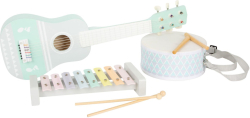 Комплектът от музикални инструменти, състоящ се от китара, ксилофон и барабан в нежни пастелни цветове, осигурява уникални музикални забавления. Трите атрактивно проектирани инструмента не само ще превърнат детската стая в концертна зала, но и ще бъдат атрактивен акцент! С тези музикални инструменти децата могат да се потопят в света на музиката и да се докоснат до първите си преживявания с ритъм и звук. Инструментите насърчават детското творчество.