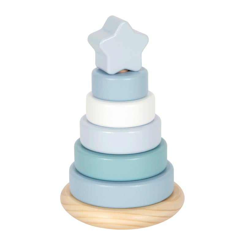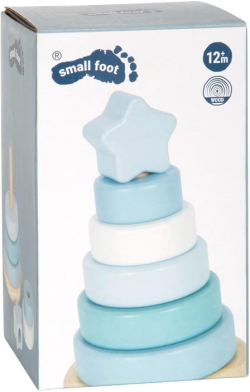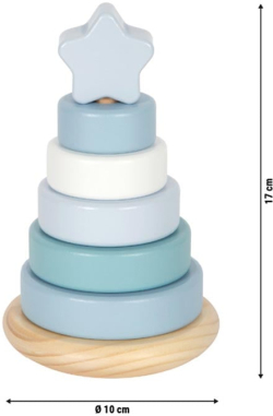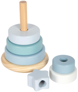 Седем пастелни ринга и заоблена основа приканват малките ръчички да сортират по размер, да подреждат и да наблюдават как кулата леко се поклаща. Успокояваща класика с елегантен дизайн.