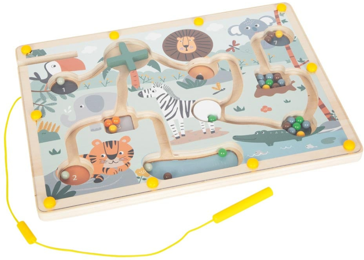 Води цветните мъниста през отпечатан пейзаж от сафари с помощта на вградения магнитен стилус. Без отделни части, идеален е за пътуване, като подпомага захвата на молив и концентрацията.