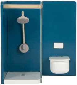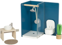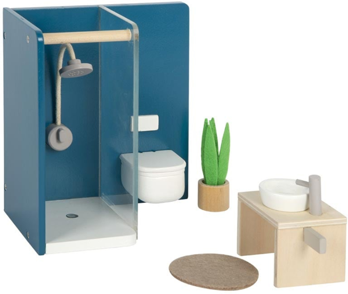 - Комплект мебели за баня: В този комплект ще намерите всичко необходимо за една напълно обзаведена баня за кукли – мивка с огледало, тоалетна, душ и шкаф за съхранение на аксесоари. Всеки елемент е прецизно изработен от дърво, което гарантира здравина и дълготрайност.