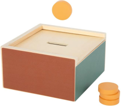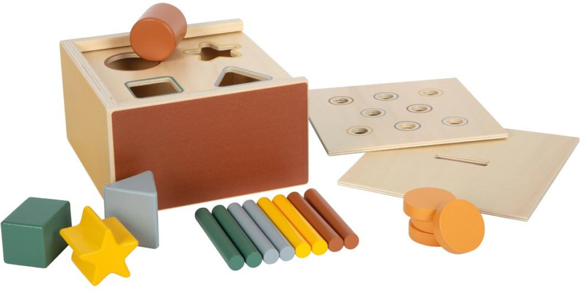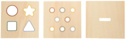 Многофункционална кутия за форми с три сменяеми капака и разнообразни елементи. Децата изследват цветове, форми и пространствени отношения, докато тренират целенасочено хващане—в стил Монтесори.