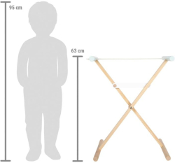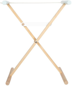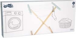 Реалистичен дървен сушилник за дрехи с памучни въженца за ролеви игри на „пране“. Лек и сгъваем, той се прибира плоско след игра и е лесен за сглобяване от децата.