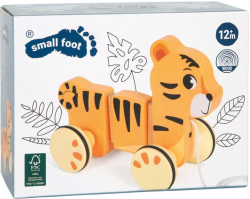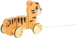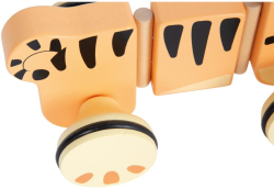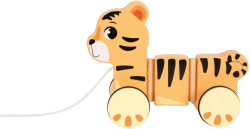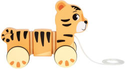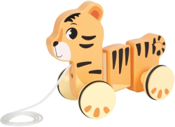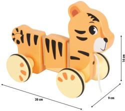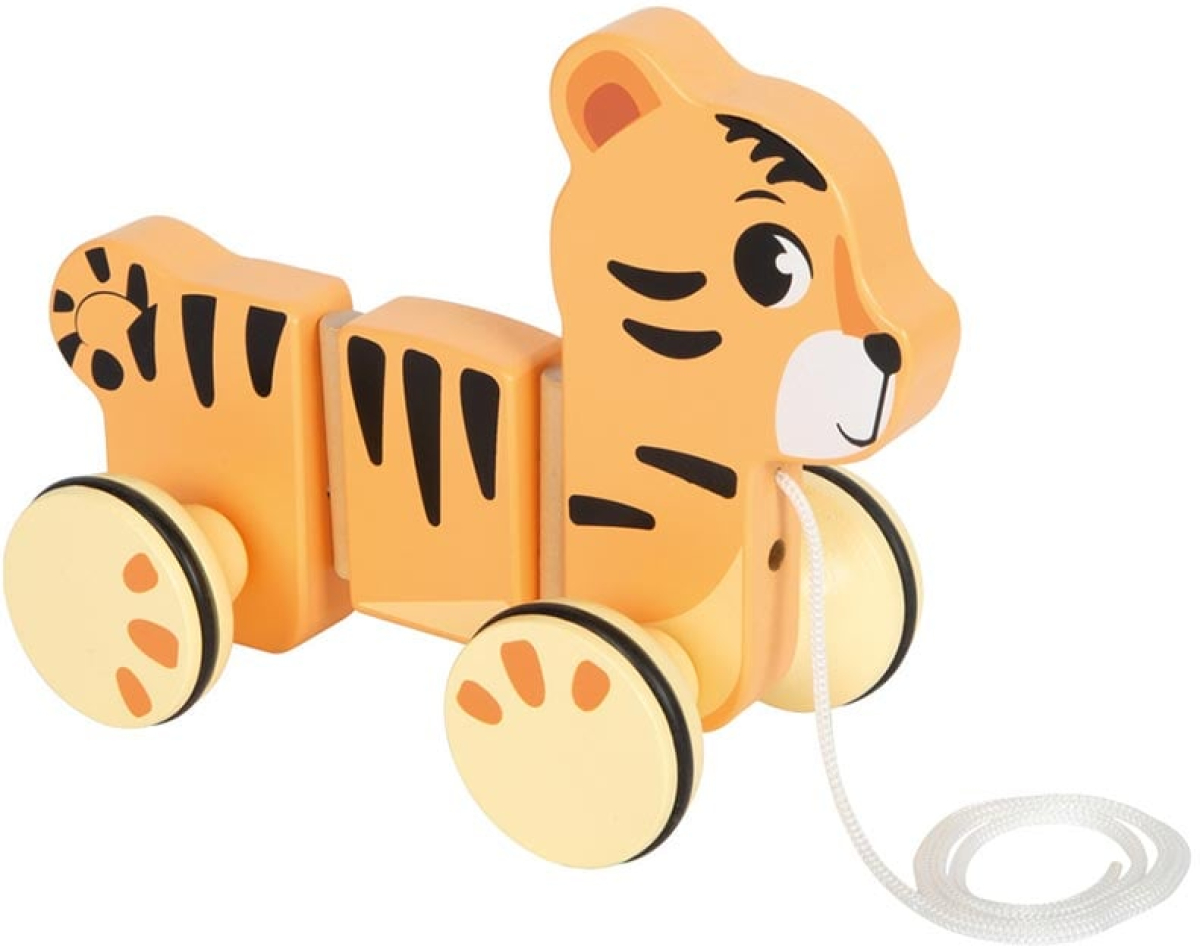 Весел тигър-компаньон на гладки, гумирани колела. Сегментираното му тяло се поклаща, когато се дърпа, насърчавайки движението и първите самостоятелни стъпки.