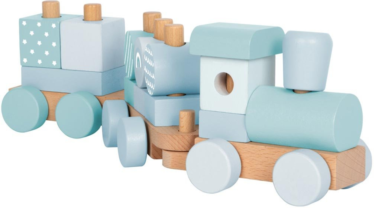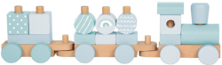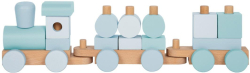 Модерен 2-в-1 дървен влак и игра за вграждане в успокояващи сини тонове. Включва 14 елемента за нанизване, локомотив и два вагона. Блокчетата могат да се използват и отделно за креативна игра.