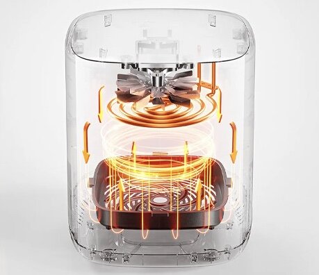 Дизайнът с кръгла вентилация, комбиниран с 3D циклонна кошница, доставя горещ въздух директно до дъното на кошницата, като гарантира, че храната е равномерно хрупкава.