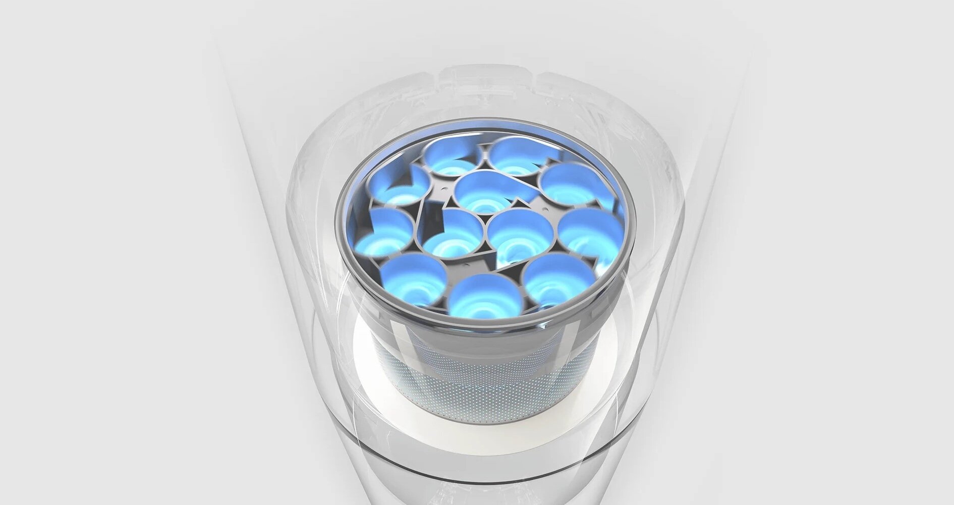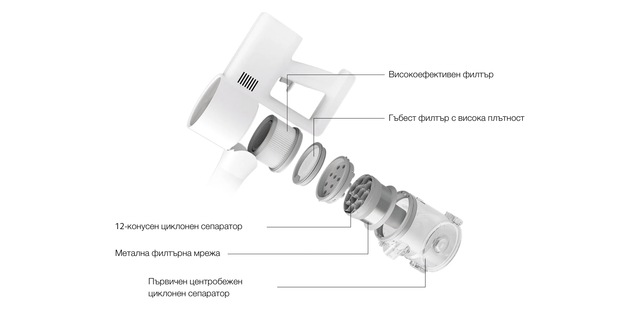 Оборудвана с 12-конусна система за отделяне на прах от циклона, вакуумът генерира силна центробежна сила чрез циклоничен въздушен поток. Ефективно изпраща големите частици на дъното на отделението за прах, като същевременно поддържа плавен въздушен поток за повишаване на ефективността на филтриране.