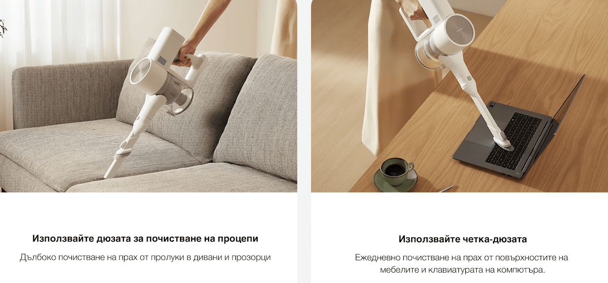 Отстранявайте с лекота скрития прах от пролуките, плаващия прах по повърхностите и праха, натрупан на високи места, като превключвате дюзата, когато е необходимо, без да оставяте зони без видимост.