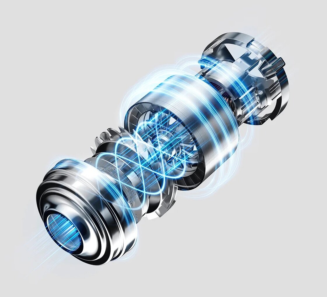 С модернизиран високопроизводителен безчетков двигател с максимална мощност на засмукване 150 AW, с 25% по-висока от тази на предишното поколение, уредът ефективно отстранява големи отпадъци, дълги косми по килимите и прах от дълбоки пролуки.