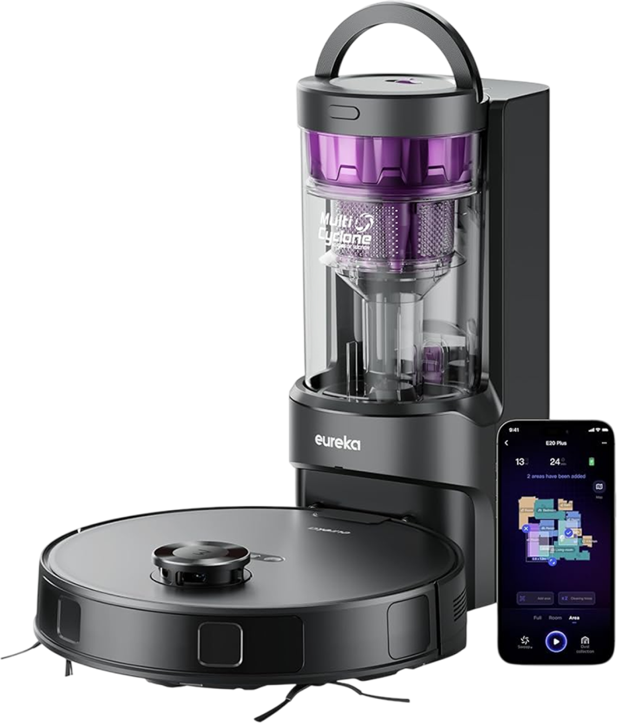 Eureka NERE20PLUSBK разполага със самоизпразваща станция и безторбова система с Multi Cyclone събиране на прах, за по-малко ръчна намеса. Поддръжката чрез гласов контрол и съвместимост с Google Assistant, Amazon Alexa и Siri улесняват управлението, а до 180 мин работа с батерия 5200 mAh е практично решение за по-големи пространства.