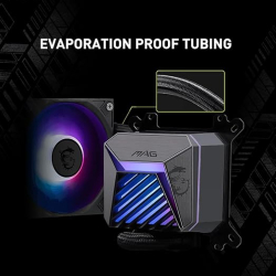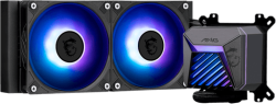 MSI MAG CORELIQUID A15 240 е водно охлаждане за процесор с двоен 120 мм ARGB вентилатор, проектирано за ефективно охлаждане и визуално впечатление. Поддържа основни сокети Socket AM4, AM5, 1700 и 1851, което го прави съвместимо както с Intel, така и с AMD процесори.