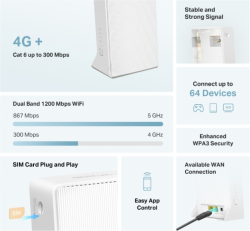 С 4G+ Cat6 (Carrier Aggregation) получавате LTE скорости до 300 Mbps за изтегляне и до 50 Mbps за качване, а двулентовият Wi‑Fi AC1200 осигурява стабилна безжична мрежа за стрийминг, онлайн игри и работа от разстояние. Рутерът поддържа едновременна връзка с до 64 устройства, което го прави подходящ за дом, офис или ваканционен имот.