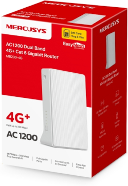 Безжичен Рутер Mercusys MB230-4G 4G+ Cat6 AC1200 Dual Band Gigabit е практично решение за бърз интернет навсякъде, където имате мобилно покритие. Поставяте nano SIM карта и започвате да споделяте връзка без сложни настройки.