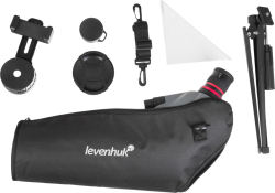 Комплектът включва метален настолен триножник, който осигурява стабилно позициониране на тръбата, торбичка за транспортиране и съхранение, адаптер за смартфон, защитни капачки за окуляра и обектива, както и кърпичка за почистване на оптиката и ръководство за потребителя.